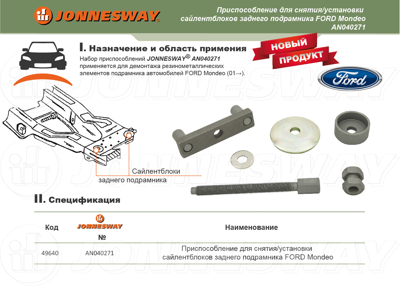Набор приспособлений JONNESWAY® AN040271 применяется для демонтажа резинометаллических элементов подрамника автомобилей FORD Mondeo (01→).